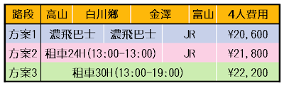 有過在北海道租車的經驗之後,這次中部之旅也想找機會租車,畢竟與大眾運輸工具比起來,自行開車擁有行動自由(不論時間或地點)的優點,又不需扛著行李跑跑走,而且四個人共同分擔費用甚至比坐巴士或電車的費用還低。下圖就是我們這次最適合租車的路段,從高山出發一直玩到富山而後跨越黑部立山,如此一來三個路段就可以把行李都丟在車上,到每個景點也不用在路邊浪費時間等巴士,但經過精算之後卻發現事情沒有想像中的美好。 規劃路段圖 本旅程方案比較表 省錢方案比較表...